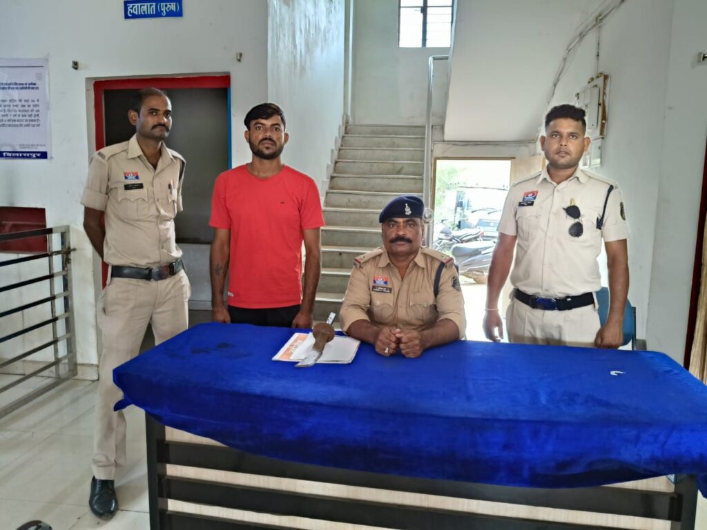 मामले का विवरण – इस प्रकार है कि श्रीमान वरिष्ठ पुलिस अधीक्षक महोदय बिलासपुर श्री राजनेश सिंह द्वारा जिला बिलासपुर के समस्त थाना प्रभारियों को शख्त हिदायत देकर सार्वजनिक स्थानों में तलवार चाकू लेकर आम नागरिकों को डराने धमकाने वालों पर कार्यवाही करने का निर्देश दिया गया है उक्त निर्देश के पालन में अतिरिक्त पुलिस अधीक्षक एसीसीयू श्री अनुज कुमार एवं नगर पुलिस अधीक्षक चकरभाठा श्रीमती रश्मित कौर चावला के मार्गदर्शन में आज दिनांक को जरिए मुखबिर से सूचना प्राप्त हुआ कि चकरभाठा वार्ड क्रमांक 09 भाटापारा नीमगली के पास एक व्यक्ति लोहे का तलवार लेकर लहराते हुए आम जनों को डरा रहा है। उक्त सूचना से वरिष्ठ अधिकारियों को अवगत कराते हुए तत्काल मय हमराह स्टाफ के घटना स्थल पहुंच कर उक्त व्यक्ति को अभिरक्षा में लेकर नाम पता पूछने पर अपना नाम अजय उर्फ भालू वर्मा पिता अशोक वर्मा उम्र 25 वर्ष निवासी चकरभाठा वार्ड क्र. 09 चकरभाठा जिला बिलासपुर का रहने वाला बताया जिसके कब्जे से एक लोहे का तलवार जप्त कर उसके विरुद्ध आर्म्स एक्ट की धारा 25, 27 के तहत कार्यवाही कर माननीय जेएमएफसी न्यायालय बिल्हा के समक्ष पेश किया गया है।