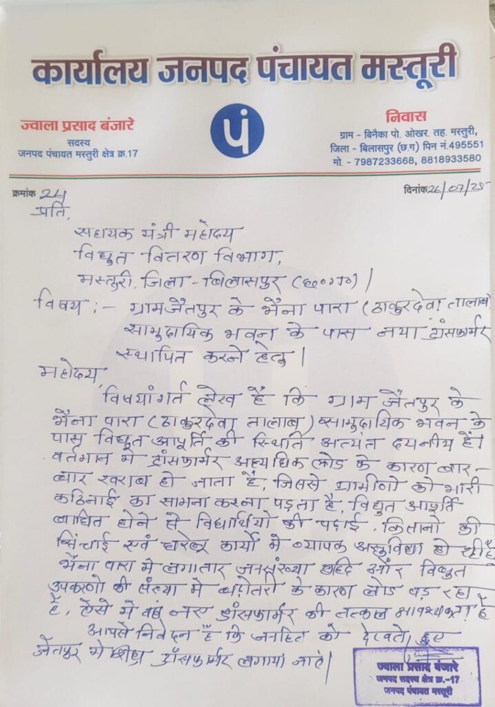 मस्तूरी। जनपद क्षेत्र क्रमांक 17 अंतर्गत ग्राम जैतपुर के भैनापारा मोहल्ले में बिजली की गंभीर समस्या को लेकर जनपद सदस्य श्री ज्वाला प्रसाद बंजारे ने विद्युत विभाग को पत्र लिखकर नया ट्रांसफार्मर स्थापित करने की मांग की है। प्रस्तावित स्थल सामुदायिक भवन के पास है, जहां ट्रांसफार्मर की स्थापना से दर्जनों परिवारों को बड़ी राहत मिल सकेगी।