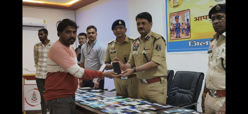 बिलासपुर जिले के विभिन्न थाना क्षेत्रो में मोबाईल गुमने की शिकायत को गम्भीरता से लेते हुये वरिष्ठ पुलिस अधीक्षक बिलासपुर श्री रजनेश सिंह (भा.पु.से.) द्वारा गुम मोबाईल तलाश कर संबंधितो को वापस करने के निर्देश दिये गये थे। निर्देश के पालन में अतिरिक्त पुलिस अधीक्षक (ग्रामीण व एसीसीयू) श्री अनुज कुमार के मार्गदर्शन में ए.सी.सी.यू. बिलासपुर के अधिकारी कर्मचारियो द्वारा चेतना अभियान चलाकर छत्तीसगढ के विभिन्न जिलो सहित मध्य प्रदेश, झारखण्ड, उडीसा एवं महराष्ट्र से करीब 220 नग मोबाईल बरामद किया गया जिसे आज दिनाँक 07.08.2025 को वरिष्ठ पुलिस अधीक्षक श्री रजनेश सिंह (भा.पु.से.) द्वारा मोबाईल धारको को वापस प्रदान किया गया है। वापस किये गये मोबाईल की कीमत लगभग 50 लाख रू है। गुमे हुये मोबाईल वापस पाने की आस छोड चुके व्यक्तियो को जब उनका मोबाईल वापस किया गया तो वे लोग काफी खुश हुये और बिलासपुर पुलिस के इस चेतना अभियान की सराहना करते हुये वरिष्ठ पुलिस अधीक्षक श्री रजनेश सिंह (भा.पु.से.) सहित बिलासपुर पुलिस के सभी अधिकारी कर्मचारियों के प्रति धन्यवाद ज्ञापित किया गया।