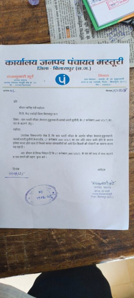 बिलासपुर पचपेड़ी के अंतर्गत भरारि फीडर के ग्राम पंचायत में केवतरा सुकुलकारी जलसों सुलौनी के lt कनेस्कन 11 kv का तर को अति ज्यादा जर्जर होने के कारण हमेशा फाल्ट होते रहते है जिससे समस्त ग्रामवासियों को आए दिन बिजली की परेशानी से गुजरना पड़ता है इसे ग्रामीणों में आक्रोश बढ़ रहा है ग्रामीणों का कहना है कि कई बार बिजली विभाग के अधिकारी को जर्जर तर को बदलने के लिए आवेदन दिया गया था उसके बावजूद भी अधिकारी चुप्पी साधे बैठे रहते है पचपेड़ी सबस्टेशन से जो 11 kv ओल्ट का तर भरारी फिडर से कई गांव को जोड़ता हैं वह तर को 1982 से लगा है जिससे तर हमेशा टूटता रहता है जिसे बिजली की परेशानी बढ़ती रहते हैं ग्रामीणों का मांग है कि पूरे भरारी फिडर में केवटाडीह तक नया तर लगना चाहिए जिसे बिजली की कोई कमी नहीं आ सके और विद्युत विवरण प्रणाली का सुधार अच्छे तरीका से करे ताकि जो बिजली की परेशानी दुबारा न हो सके