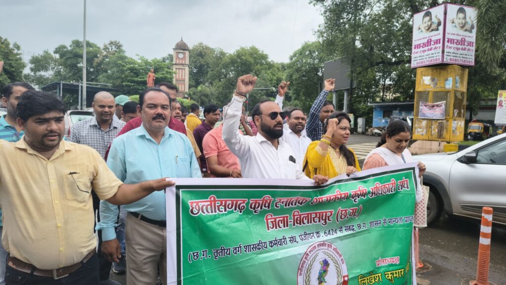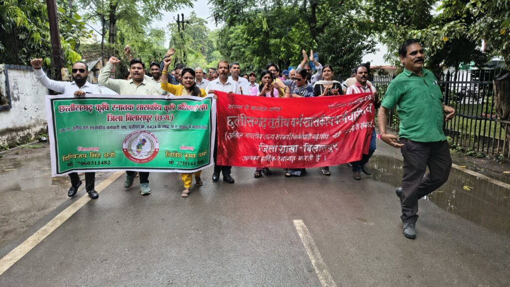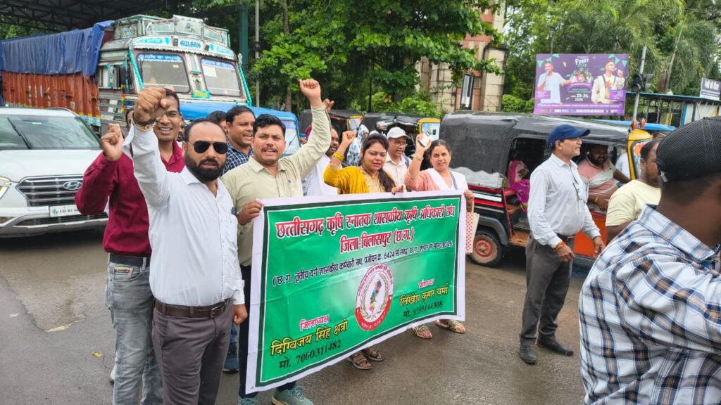 आज दिनांक 22/08/2025 को छत्तीसगढ़ क़ृषि स्नातक शासकीय क़ृषि अधिकारी संघ बिलासपुर द्वारा छत्तीसगढ़ कर्मचारी अधिकारी फेडरेशन के आह्वान पर आयोजित एक दिवसीय हड़ताल में शामिल होकर छत्तीसगढ़ शासन से 11 सूत्रीय मांगो को पूरा करने मांग किया l संघ के सदस्यों द्वारा संघ के बैनर के साथ कोन्हेर गार्डन नेहरु चौक से सभा स्थल तक रैली निकालकर सभा स्थल में हड़ताल को समर्थन दिया। जिलाध्यक्ष दिग्विजय सिंह क्षत्री ने शासन से 11 सूत्रीय मांगो का समर्थन करने के साथ कृषि विभाग के ग्रामीण कृषि विस्तार