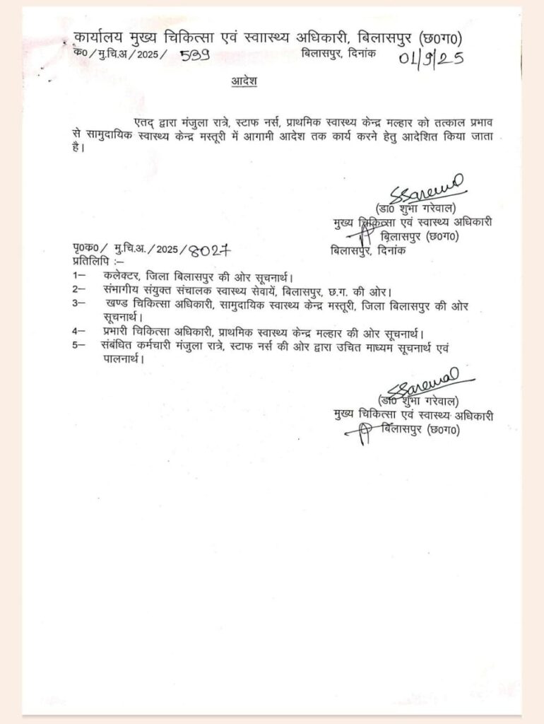 मस्तूरी। प्राथमिक स्वास्थ्य केंद्र मल्हार में स्टाफ नर्स मंजुला रात्रे के द्वारा मनमानी करते हुए छोटे कर्मचारियों से अभद्र व्यवहार व अपने कार्य में लापरवाही करने का मामला आऐ दिन मिलती रहती थी, जिसके कारण क्षेत्र के ग्रामीणों को स्वास्थ्य सम्बन्धी समस्या का सामना करना पड़ रहा था, साथ ही मरीजों के परीजनो व क्षेत्र के जनप्रतिनिधियों से भी मंजुला रात्रे द्वारा अभद्र व्यवहार किया जाता था।जिस कारण से क्षेत्रीय जनपद सदस्य ज्वाला प्रसाद बंजारे एवं नगर पंचायत मल्हार के पार्षद ने जिला स्वास्थ्य एवं चिकित्सा अधिकारी से स्टाफ नर्स मंजुला रात्रे की शिकायत भी किया था। जिसे मस्तूरी क्षेत्र के पत्रकारों ने प्रमुखता से ख़बर प्रकाशित भी किया था। जिसे संज्ञान में लेते हुए जिला स्वास्थ्य एवं चिकित्सा अधिकारी डॉक्टर शुभा गरेवाल ने प्राथमिक स्वास्थ्य केंद्र मल्हार से हटाकर मस्तूरी सामुदायिक स्वास्थ्य केंद्र में तबादला कर दिया है।