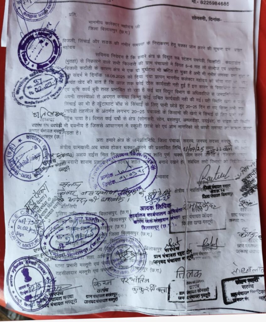 मस्तूरी//बिलासपुर जिले के मस्तूरी विधानसभा के पचपेड़ी तहसील के जोंधरा क्षेत्र में बिजली पानी और सड़क की समस्या को लेकर जनप्रतिनिधियों के नेतृत्व में बिलासपुर कलेक्टर को दिनांक 18,8,25 को ज्ञापन सौपा गया था यह ज्ञापन सैकड़ो ग्रामीणों की उपस्थिति में बिलासपुर कलेक्टर को सौपा गया था जिसमें उन्होंने बिजली पानी सड़क की समस्याओं को जल्द से जल्द दूर करने की बात कही थी पर आज भी व्यवस्था ज्यों का त्यों बना हुआ है ग्रामीण अपने मूलभूत सुविधाओं के लिए जूझ रहे हैं लगातार क्षेत्र में बिजली कटौती लो वोल्टेज की समस्या रोड की समस्या जल की समस्या आदि के लिए जूझ रहे हैं ज्ञापन में ग्रामीणों ने बताया था कि अगर समस्या दूर नहीं हुई तो उनके द्वारा 11 सितंबर 2025 को चक्का जाम किया जाएगा जिसके तरमतान्य में दिनांक 11 सितंबर 2025 यानी आने वाले गुरुवार को मतलब कल पचपेड़ी क्षेत्र के दर्जनों गांव के जनप्रतिनिधियों के नेतृत्व में चक्का जाम होने जा रहा है जिसके लिए सभी गांव में बैठक भी आज शाम रखी गई है चक्का जाम की रूपरेखा इन्हीं बैठकों में तैयार किया जा रहा है आपको बताते चले कि पचपेड़ी क्षेत्र के दर्जनों गांव रोड और बिजली की समस्या से लगातार जूझ रहे हैं ग्रामीण उच्च अधिकारियों से लेकर मस्तूरी क्षेत्र में पदस्थ सभी अधिकारियों को इन समस्याओं से अवगत करा चुके हैं बार बार इनके पास जाकर समस्या गिना रहें हैं लेकिन सुधार के नाम पर कुछ भी नहीं हो रहा है जिसके लिए ग्रामीण चक्का जाम करने के लिए बाध्य हो गए हैं और गुरुवार को नेशनल हाईवे 49 पर चक्का जाम किया जाएगा ऐसी जानकारी छन कर आ रही हैँ