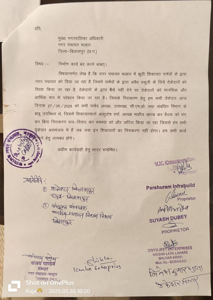 मस्तूरी। नगर पंचायत मल्हार के ठेकेदारों ने किया लिखित में नगर सीएमओ को शिकायत पार्षदों के द्वारा नगर पंचायत मल्हार के ठेकेदारों को जानबूझकर परेशान किया जा रहा है जिसमें पार्षदों के द्वारा अवैध वसूली के लिये ठेकेदारों के कामों को रोककर विवश किया जा रहा है,साथ ही झूठी शिकायत कर ठेकेदारों को पैसे नहीं देने पर मानसिक और आर्थिक रूप से पार्षदों के द्वारा लगातार परेशान किया जा रहा है। जिसके समाधान के लिए सभी ठेकेदारो ने नगर पंचायत मल्हार में आयोजित 27/05/2025 के बैठक में सभी पार्षद अध्यक्ष, उपाध्यक्ष, सी.एम.ओ. तथा संबंधित विभाग के बाबू उपस्थित थे,वही ठेकेदारों ने पार्षदों के खिलाफ कठोर कार्यवाही करने की मांग किया है शिकायतकर्ताओ ने आरोप लगाया है कि , अध्यक्ष विवाद का समाधान न कर ओर माहौल को खराब कर बैठक को भंग कर दिया बिना निराकरण वाद-विवाद की समस्या को और जटिल किया जा रहा जिससे सभी ठेकेदारों के बीच में असमंजस की स्थित बना हुआ है जब तक इन शिकायतों का निराकरण नहीं होगा। तब तक सभी निर्माण कार्य को बन्द रखा जाएगा । ठेकेदारों ने किया लिखित में शिकायत।